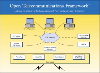 OTF Kernel can be extended by the OEM to support multi-vendor system services, media resources, and client APIs. This means that the equipment developer can gain the time-to-market advantages of a closed-architecture integrated platform, such as those available from several vendors, yet maintain control of his strategic product platform as if it were developed in house. With OTF, the system developer can assume full control of his strategic platform in every dimension.